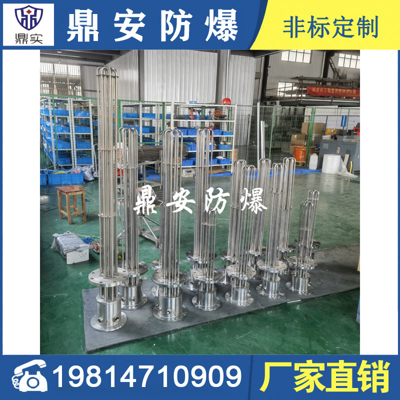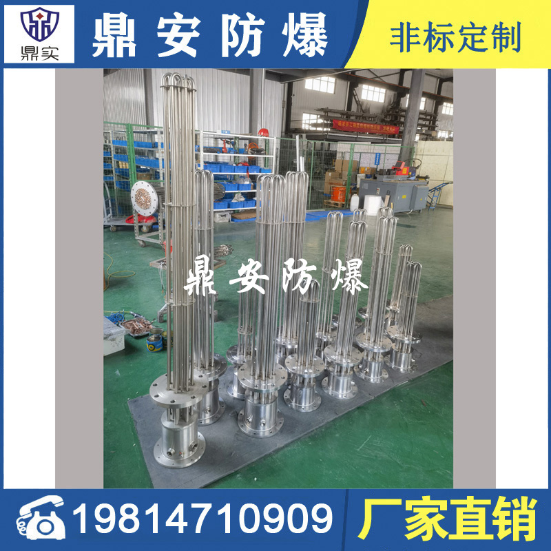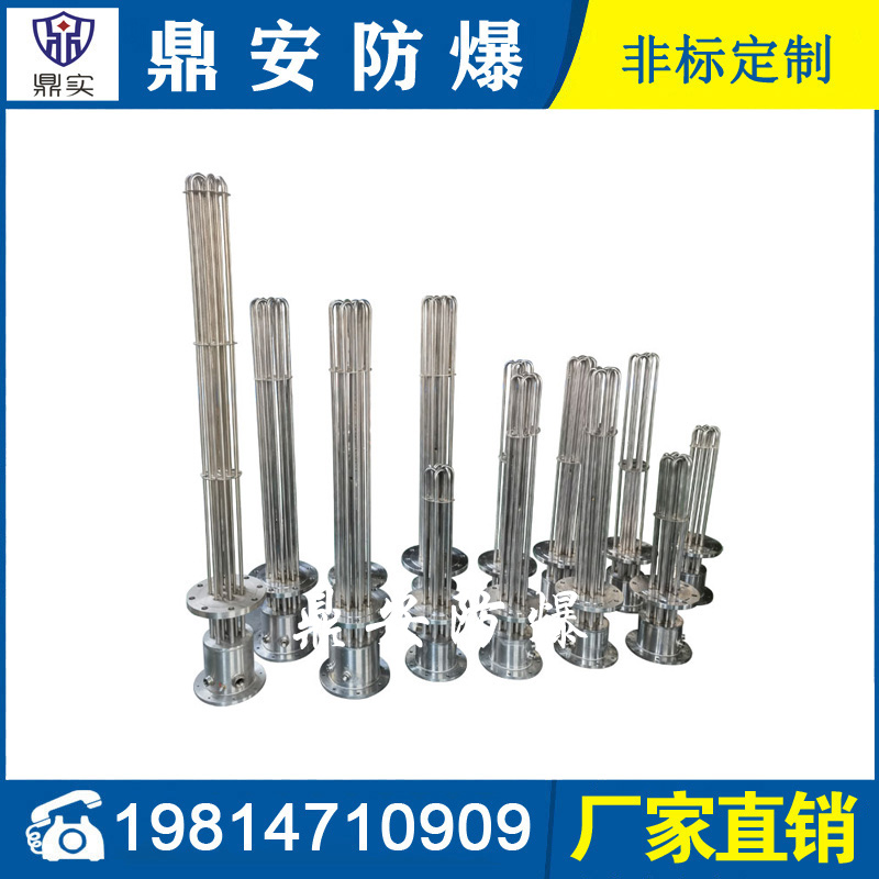 防爆法蘭加熱管是由多支加熱管焊接在法蘭上集中加熱。主要用于敞開式、封閉式的溶液箱和循環系統中加熱用。優點: 表面功率大,使一般電加熱表面負荷的2~4倍,高度密集式、結構緊湊。由于整體短而密集,故穩定性好,安裝無需支架。組合式法蘭加熱管大多采用氬弧焊接方式使電熱管于法蘭連接,也可利用緊固裝置的形式,即每支電熱管上焊由緊固件。然后與法蘭蓋采用螺母鎖緊。管子于緊固件采用氬弧焊接。緊固件密封處采用科學的工藝。單支更換方便,大大節約以后的維修成本選擇進口及國內優質材料。科學的生產工藝,嚴格的質量管理,保證電熱管優越的電氣性能。