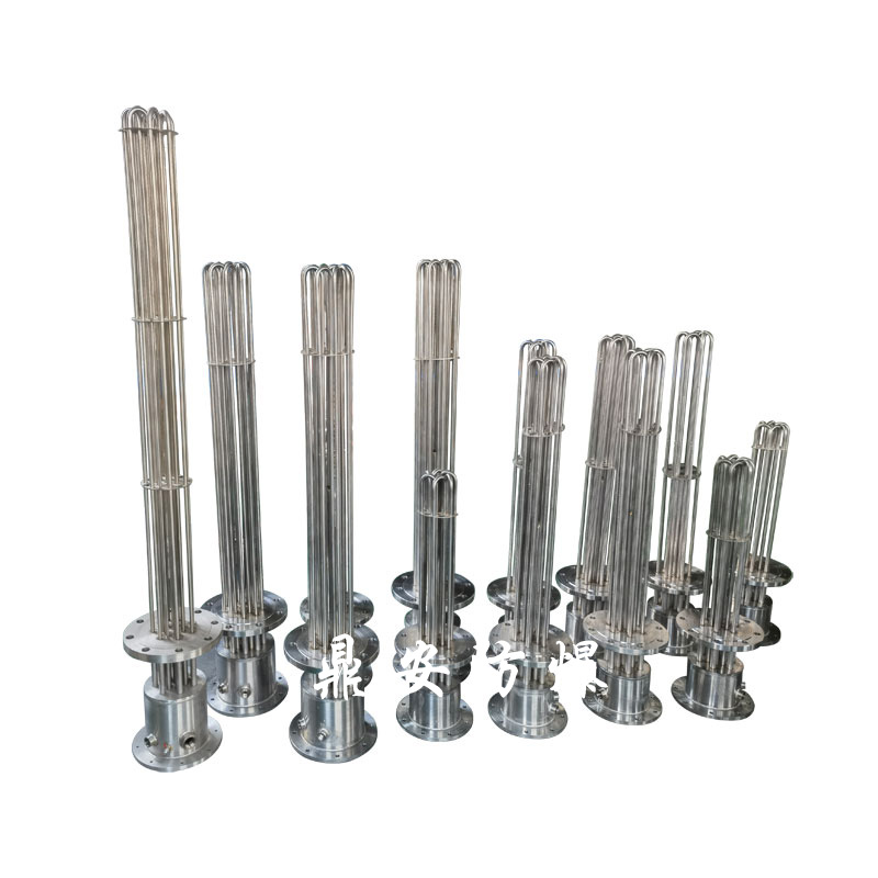 防爆法蘭電加熱管(也稱插入式電加熱器):是采用U型管狀電熱元件,依據加熱不同介質設計規范,按照功率配置要求裝配在法蘭蓋上,插入需加熱物料中,發熱元件工作時所發出的大量熱量傳導給被加熱介質使介質溫度升高,達到所需的工藝要求。當介質溫度達到工藝要求的設定值時,控制系統根據溫度傳感器信號,經PID 運算后調節電加熱器輸出功率,對發熱元件的電阻性負載實現溫度控制。使介質溫度均勻,達到所需要求;當發熱元件超溫或低液位時,發熱元件的聯鎖保護裝置立即切斷加熱電源避免發熱元件燒壞,延長使用壽命。