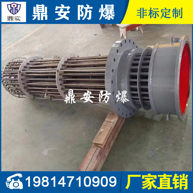 防爆法蘭加熱管是由多支加熱管焊接在法蘭上集中加熱。主要用于敞開式、封閉式的溶液箱和循環系統中加熱用。優點: 表面功率大,使一般電加熱表面負荷的2~4倍,高度密集式、結構緊湊。由于整體短而密集,故穩定性好,安裝無需支架。組合式法蘭加熱管大多采用氬弧焊接方式使電熱管于法蘭連接,也可利用緊固裝置的形式,即每支電熱管上焊由緊固件。然后與法蘭蓋采用螺母鎖緊。管子于緊固件采用氬弧焊接。緊固件密封處采用科學的工藝。單支更換方便,大大節約以后的維修成本選擇進口及國內優質材料。科學的生產工藝,嚴格的質量管理,保證電熱管優越的電氣性能。