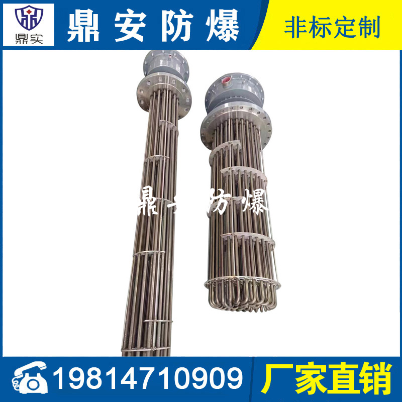 防爆法蘭電加熱管(也稱插入式電加熱器):是采用U型管狀電熱元件,依據加熱不同介質設計規范,按照功率配置要求裝配在法蘭蓋上,插入需加熱物料中,發熱元件工作時所發出的大量熱量傳導給被加熱介質使介質溫度升高,達到所需的工藝要求。當介質溫度達到工藝要求的設定值時,控制系統根據溫度傳感器信號,經PID 運算后調節電加熱器輸出功率,對發熱元件的電阻性負載實現溫度控制。使介質溫度均勻,達到所需要求;當發熱元件超溫或低液位時,發熱元件的聯鎖保護裝置立即切斷加熱電源避免發熱元件燒壞,延長使用壽命。