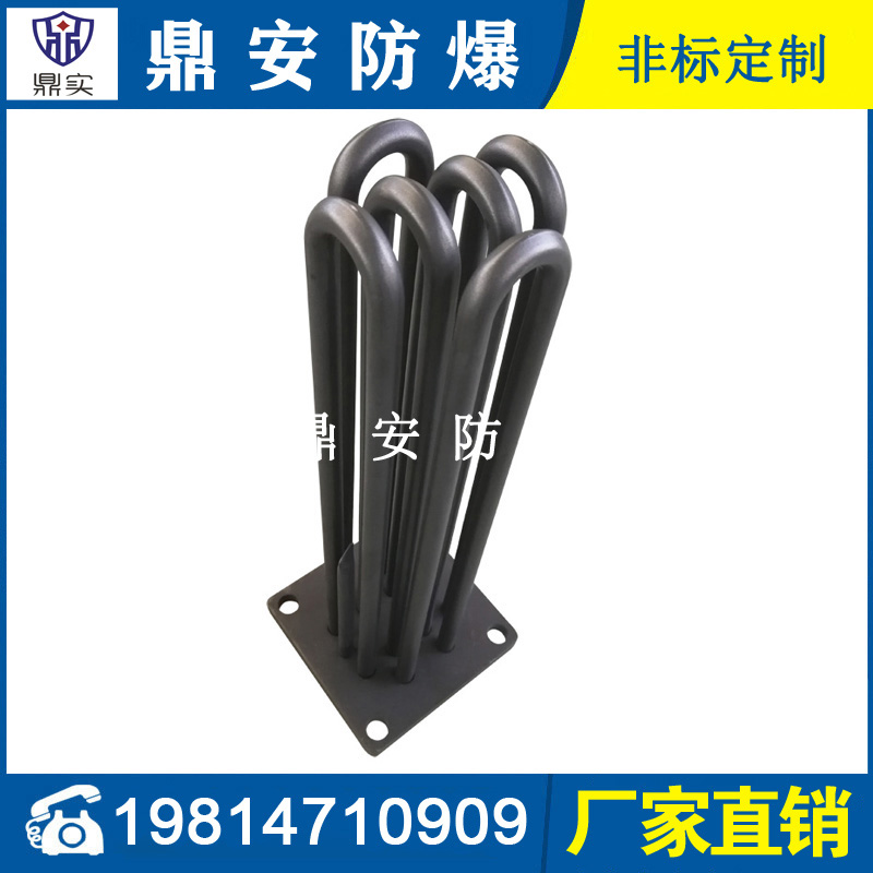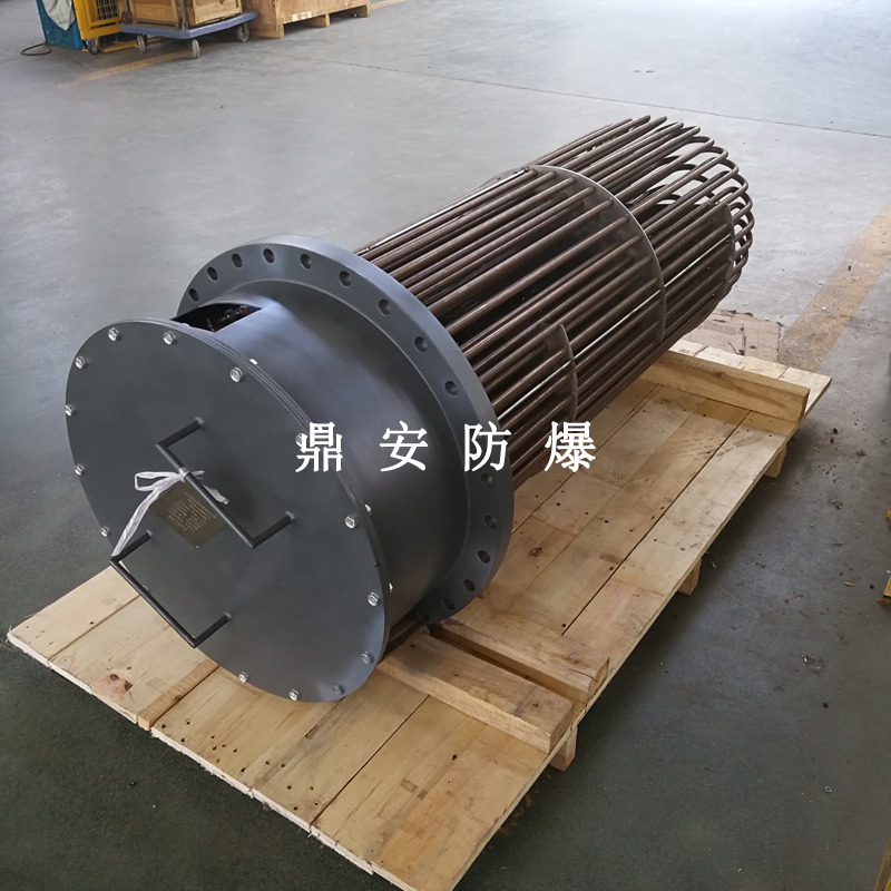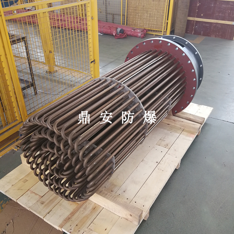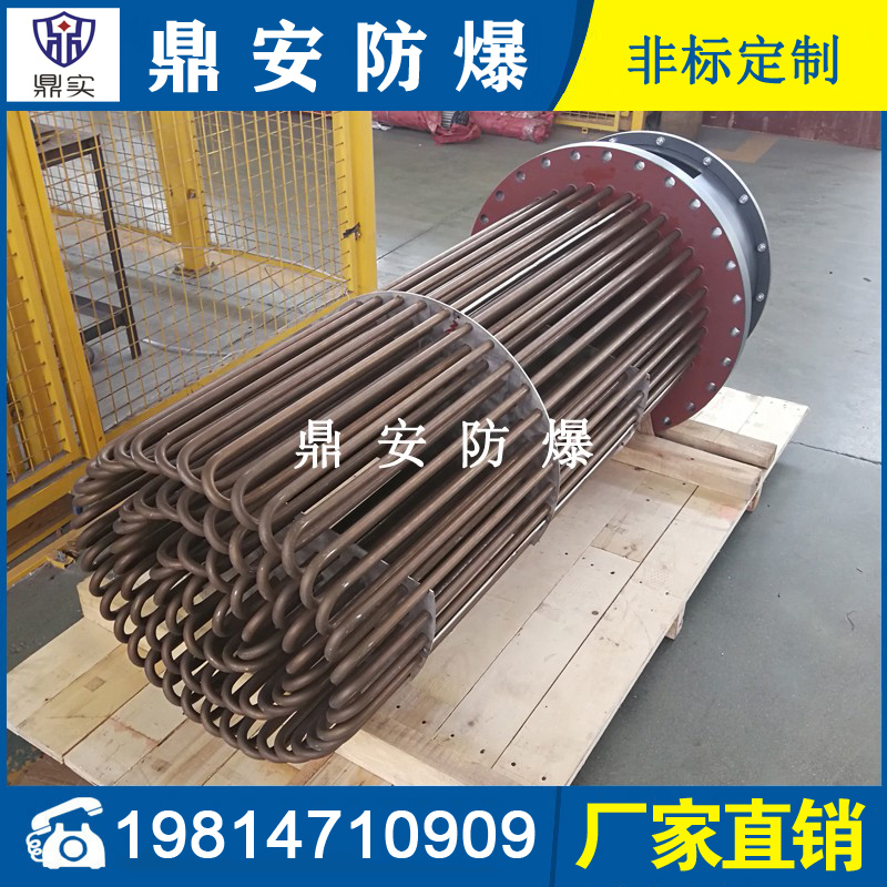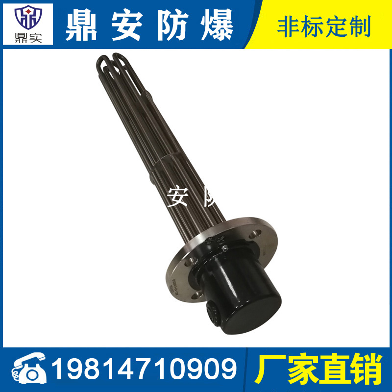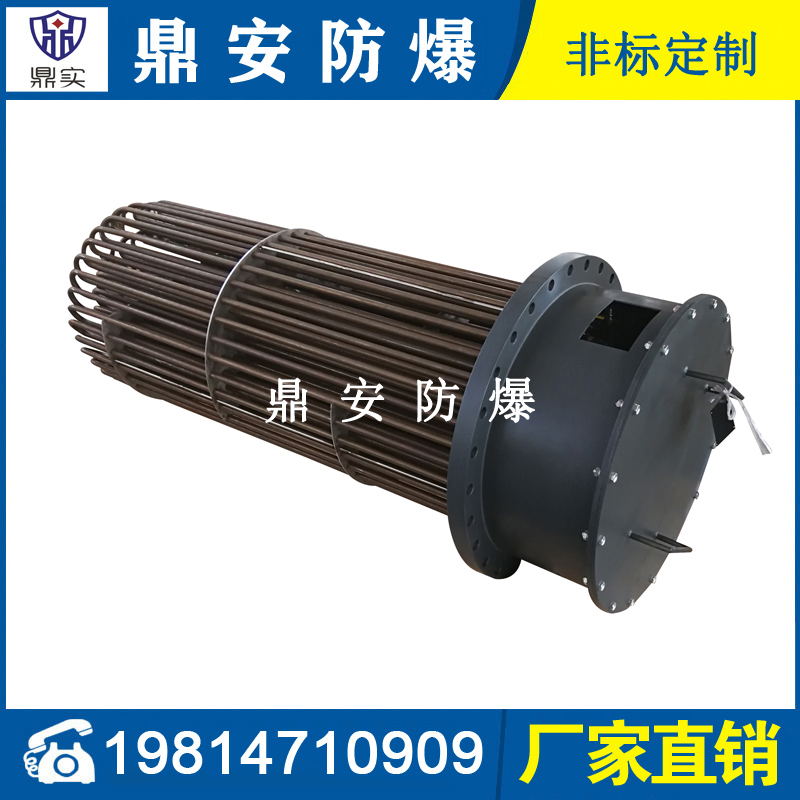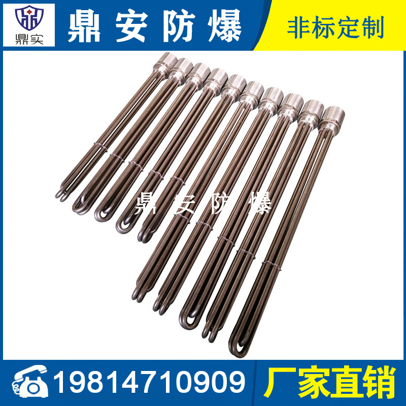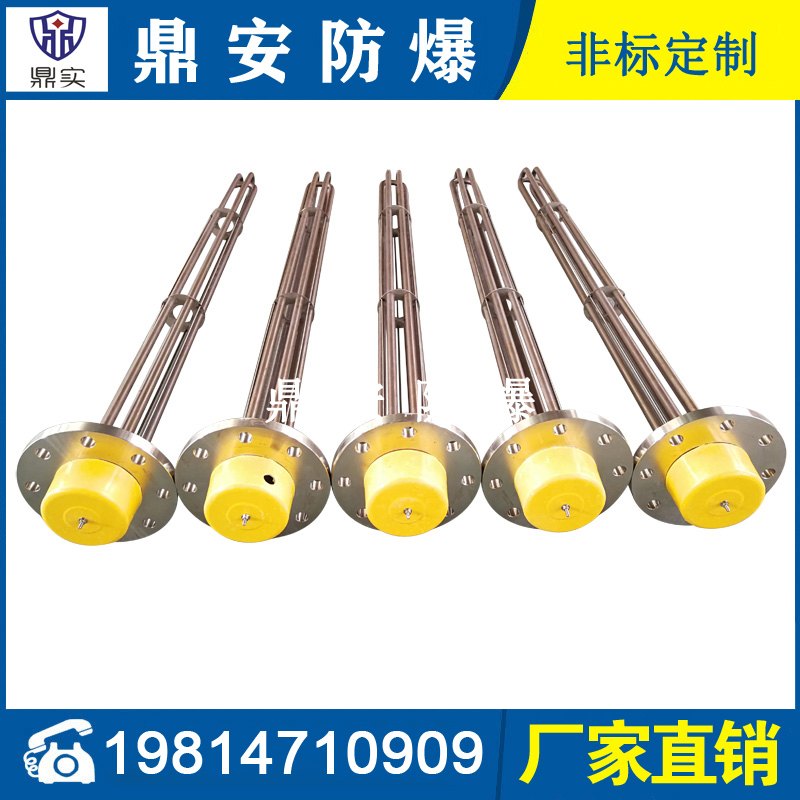 法蘭電熱管(也稱插入式電加熱器):是采用U型管狀電熱元件,多支U型電熱管焊接在法蘭上集中加熱,依據加熱不同介質設計規范,按照功率配置要求裝配在法蘭蓋上,插入需加熱物料中,發熱元件工作時所發出的大量熱量傳導給被加熱介質使介質溫度升高,達到所需的工藝要求,主要用于敞開式、封閉式的溶液箱和循環系統中加熱用。