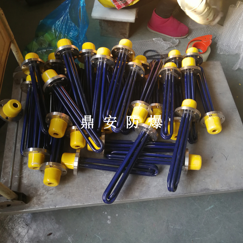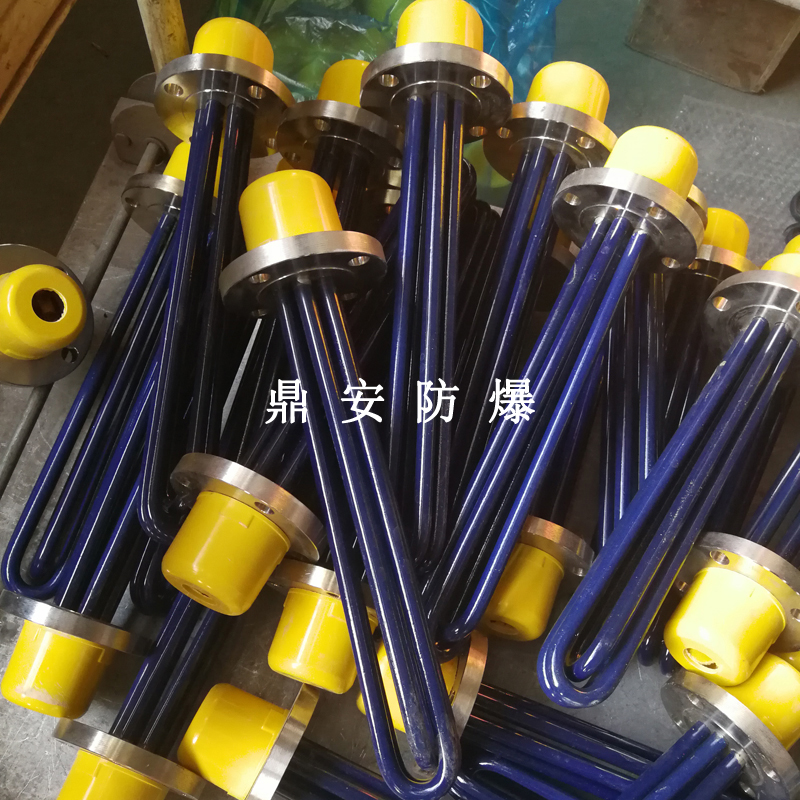 法蘭電熱管(也稱插入式電加熱器):是采用U型管狀電熱元件,多支U型電熱管焊接在法蘭上集中加熱,依據加熱不同介質設計規范,按照功率配置要求裝配在法蘭蓋上,插入需加熱物料中,發熱元件工作時所發出的大量熱量傳導給被加熱介質使介質溫度升高,達到所需的工藝要求,主要用于敞開式、封閉式的溶液箱和循環系統中加熱用。