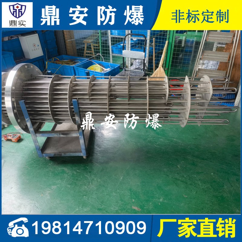 防爆法蘭式電加熱管按結構分大致可分為螺牙型和平板式法蘭型加熱器,常見的電壓:200V-220V-380V,功率按發熱根據發熱尺寸不同有:3KW-4.5KW-6KW-8KW-9KW-10KW-12KW-15KW-18KW-21KW等,通常由3-6-9支U型雙頭加熱管通過TIG氬弧焊接于法蘭組合而成。常作為鍋爐加熱器、槽體加熱器、模溫機加熱器等使用,廣泛運用于電子、塑膠、化工、環境工程的槽體-罐體-設備的加熱。螺牙型法蘭加熱器,常見的安裝螺牙(絲牙)尺寸有:1寸-1.5寸(M47*2.5)-2寸(M58*2.5)管螺牙;平板式法蘭型加熱器,常見的安裝法蘭標準有日標和國標兩種,大小有:DN32-DN40-DN50-DN65-DN80-DN100-DN125-DN150-DN200-DN250-DN350-DN400-DN450等,如日標JIS150 法蘭加熱器常見的壓力有6kg-10kg-16kg-25kg;