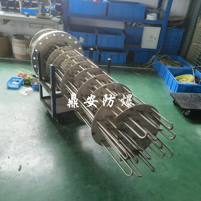 防爆法蘭加熱管是由多支加熱管焊接在法蘭上集中加熱。主要用于敞開式、封閉式的溶液箱和循環系統中加熱用。優點: 表面功率大,使一般電加熱表面負荷的2~4倍,高度密集式、結構緊湊。由于整體短而密集,故穩定性好,安裝無需支架。組合式法蘭加熱管大多采用氬弧焊接方式使電熱管于法蘭連接,也可利用緊固裝置的形式,即每支電熱管上焊由緊固件。然后與法蘭蓋采用螺母鎖緊。管子于緊固件采用氬弧焊接。緊固件密封處采用科學的工藝。單支更換方便,大大節約以后的維修成本選擇進口及國內優質材料。科學的生產工藝,嚴格的質量管理,保證電熱管優越的電氣性能。